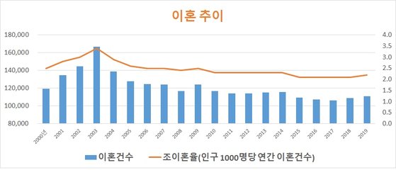 통계청에 따르면 지난해 이혼 건수가 11만 건이고 인구 1,000명당 연간 이혼 건수인 조이혼율이 2.2다. 수치가 많아 보이지 않지만 현실에선 주변에서 흔해졌다. 기자가 평일 오후에 이 기사를 작성하느라 앉아 있는 커피숍 테이블 인근 자리에서 40대로 보이는 여성 3명이 나누는 대화의 주제도 이혼이다. “안 하는 게 좋은데….”