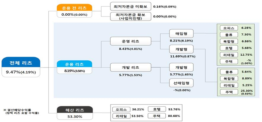 자산매각 후 해산한 리츠의 성과(53.30%)를 고려하면, 전체 리츠의 배당수익률은 9.47%까지 높아진다. 해산 리츠는 운영기간 동안 상승한 부동산 가격이 매각수익으로 나타났고, 주택의 경우 분양수익이 인식되면서 배당수익률이 전년보다 20.73%p 올랐다.