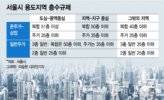 서울시는 지난 2016년 최고 50층 높이의 대치동 은마 재건축 설계안도 '퇴짜'를 놓은 적이 있다. 앞서 강남구 압구정지구의 최고 층수도 35층으로 묶었다. 법정 도시계획인 '2030 서울플랜'에 따라 층고제한을 엄격하게 35층으로 적용해 왔다. 서울시는 올 연말까지 '2040 서울플랜'을 다시 짤 계획인데 '35층룰'에 대한 전반적인 재검토가 예고된 바 있다.