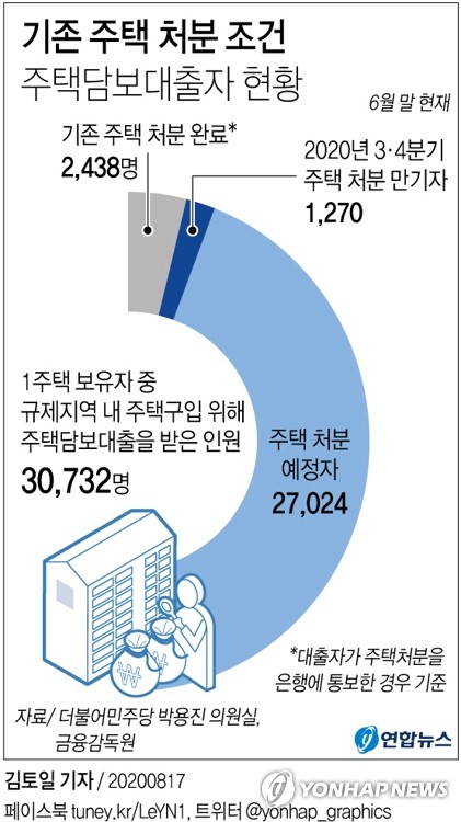 17일 금융감독원이 박용진 더불어민주당 의원에게 제출한 자료에 따르면 9·13 대책 이후 시중은행에서 기존 주택 처분하겠다는 조건으로 주담대를 받은 사람은 올해 6월 말까지 총 3만732명이다. 이 중 6월 말 현재 기존 주택을 처분한 사람은 2,438명(7.9%)으로 나타났다. 기존 주택을 아직 처분하지 않은 2만8,294명 중 올해 연말까지 만기가 돌아오는 사람은 1,270명이었다.