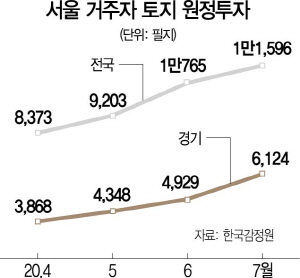 24일 한국감정원에 따르면 지난 7월 서울 거주자가 서울 이외 지역의 ‘순수 토지’ 1만1,596필지를 매수했다. 서울 거주자의 원정 토지매입은 5월(9,203필지)과 6월(1만765필지) 이어 증가세다. 7월 매수 규모는 필지 수 기준으로 2009년 12월(1만3,265필지) 이후 10년여 만에 최대 수치다.