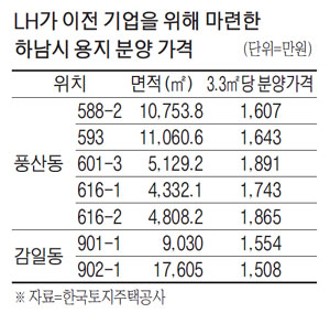 LH 관계자는 "자족 용지는 감정평가 금액으로 공급하게 돼 있다"며 "향후 하남시 상산곡동, 광암동에 공급하는 산업 용지는 조성 원가 수준으로 공급할 예정인 만큼 기업들의 애로 사항이 해결될 수 있을 것"이라고 설명했다.