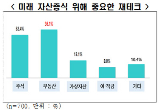 전국경제인연합회는 모노리서치에 의뢰해 국내 MZ세대 700명을 대상으로 재테크에 대한 인식을 조사한 결과 응답자의 36.1%가 향후 자산증식을 위해 가장 필요한 재테크 수단으로 부동산을 꼽았다고 22일 밝혔다.